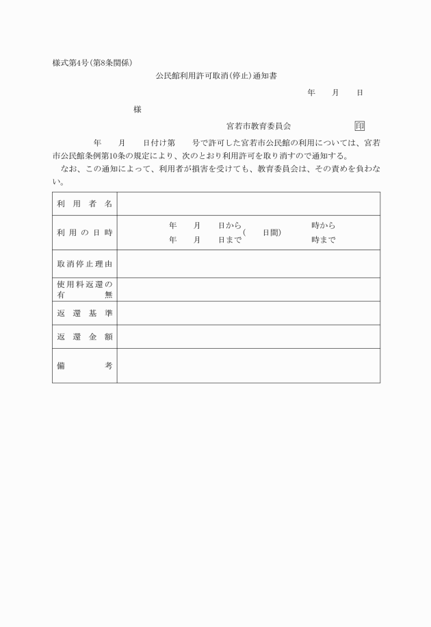 第8条 教育委員会は、利用の許可を取り消し、又はその利用を停止する場合は、公民館利用許可取消(停止)通知書(様式第4号)によるものとする。