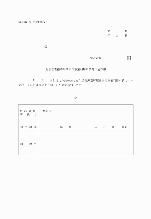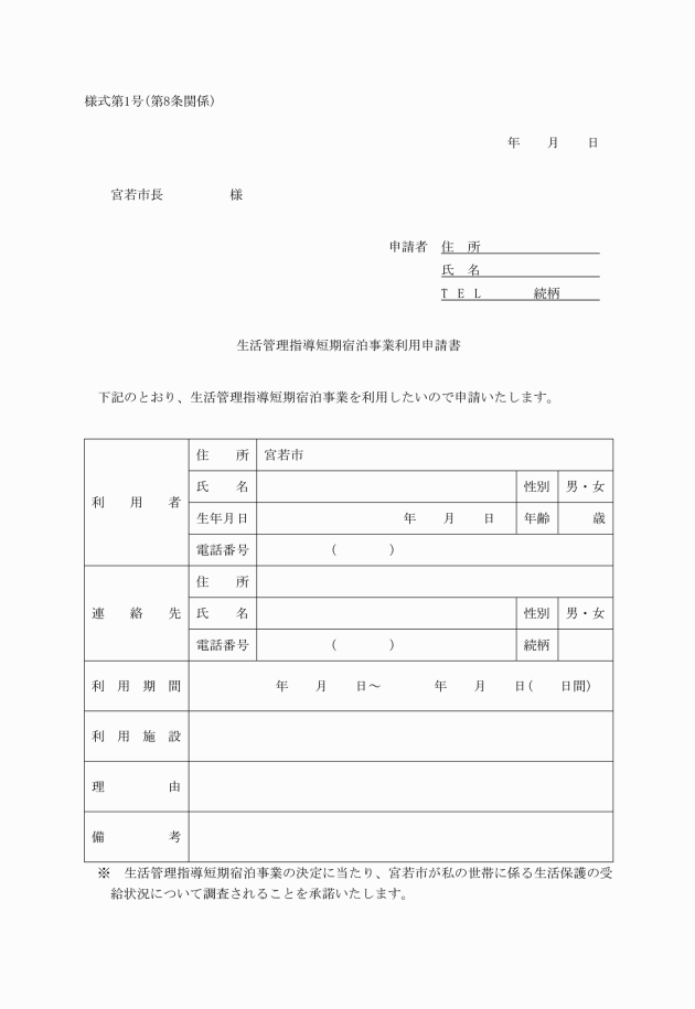 第8条 この事業の利用を希望する対象者又は家族等(以下「利用希望者」という。)は、生活管理指導短期宿泊事業利用申請書(様式第1号)を市長に提出しなければならない。ただし、緊急を要すると市長が認める場合には、利用の手続は、事後において行うことができる。
