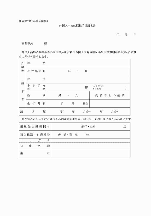 4 未支給福祉手当を受けようとする者(以下「請求者」という。)は、外国人未支給福祉手当請求書(様式第7号)を、市長に提出しなければならない。
