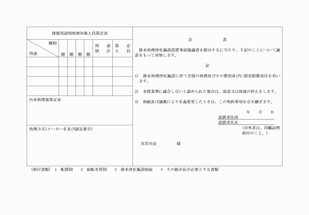 第4条 市長は、浄化施設を設置しようとする者(以下「設置者」という。)に対し、排水処理浄化施設設置事前協議書(様式第1号)により、次に掲げる事項について協議し、その適否を判断するものとする。