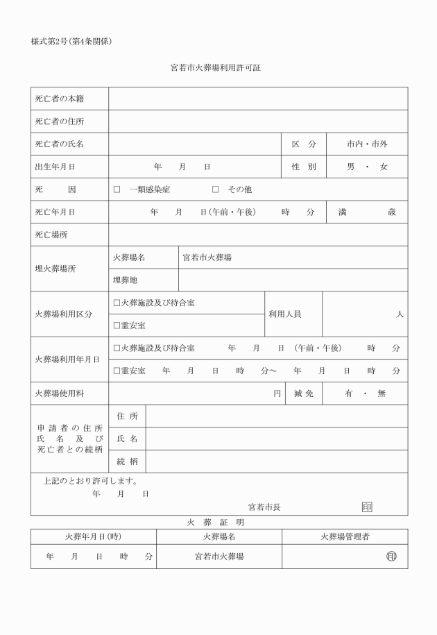 2 前項の許可を受けた者は、宮若市火葬場利用許可証を火葬場責任者に提出しなければならない。