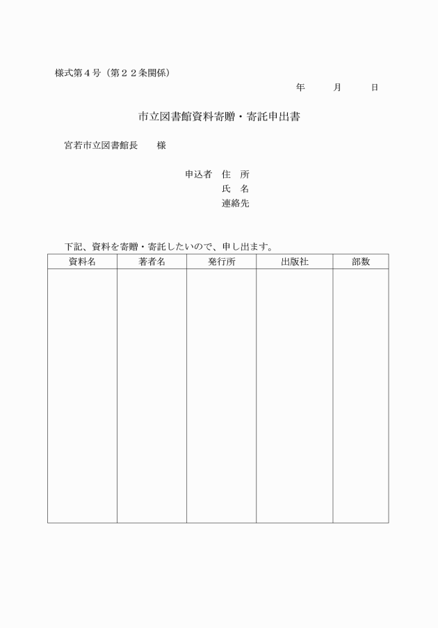 2 資料を寄贈又は寄託しようとする者は、市立図書館資料寄贈・寄託申出書(様式第4号)を館長に提出しなければならない。