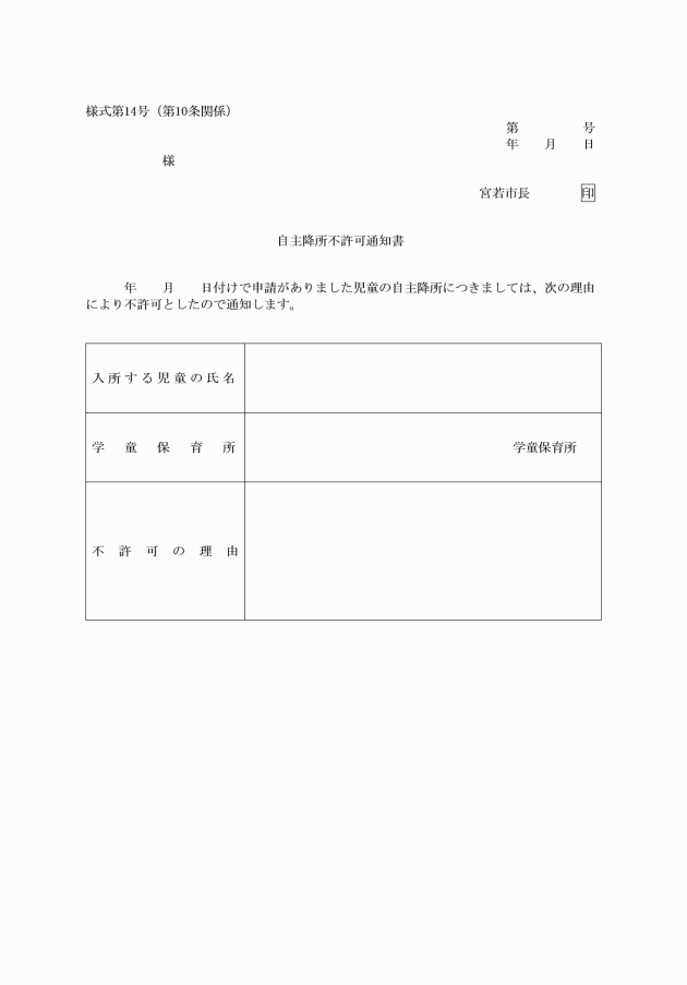 第9条 保護者は、学童保育所を児童だけで降所させるときは、自主降所許可申請書兼確約書(様式第12号)にその理由を記載し、市長に提出しなければならない。