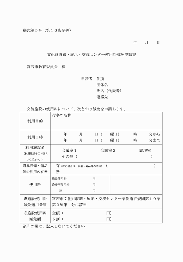 第5条 教育委員会は、申請書を受理し、適当と認めるときは、申請書の受付の順位に従って利用を許可し、文化財収蔵・展示・交流センター利用許可書(様式第2号。以下「許可書」という。)を交付する。