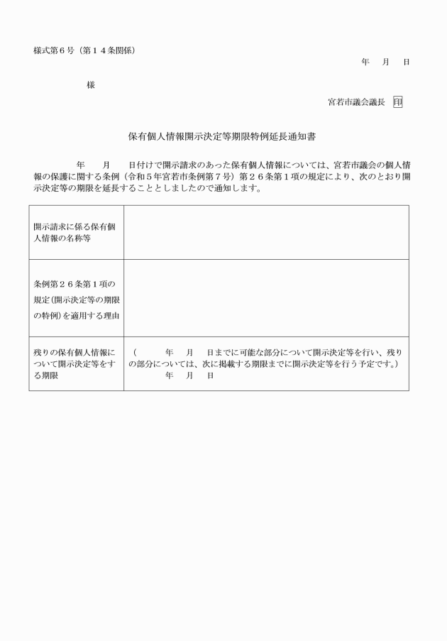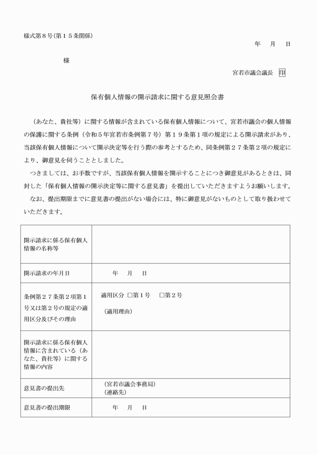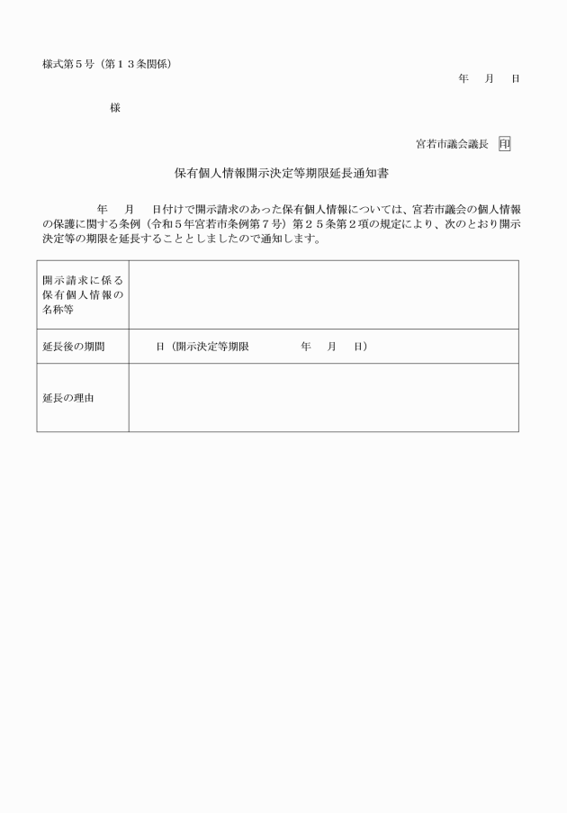 第1条 この告示は、宮若市議会の個人情報の保護に関する条例(令和5年宮若市条例第7号。以下「条例」という。)の施行に関し必要な事項を定めるものとする。