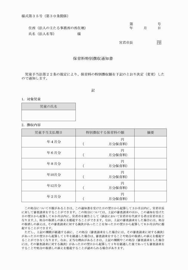 第30条 法第22条第1項の規定に基づく児童手当からの保育料の徴収(以下この条において「特別徴収」という。)をするときは、次により処理するものとする。